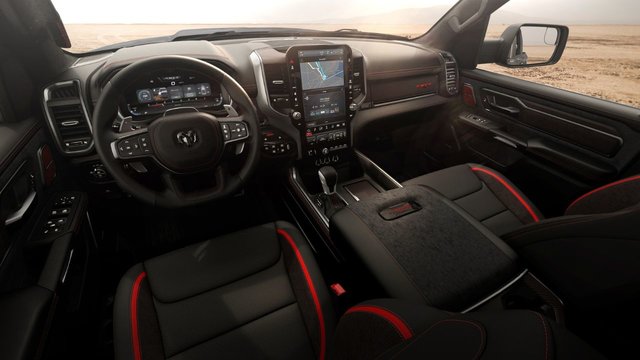 À l’intérieur, la version Bloodshot inclut des garnitures en fibre de carbone avec détails rouges, un logo de console centrale sous verre et des emblèmes TRX avec contour rouge.